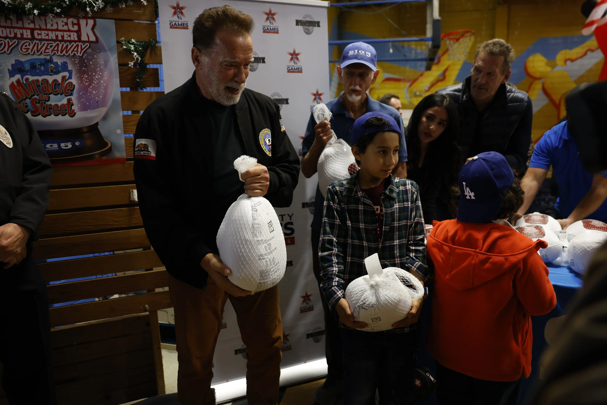 Arnold Schwarzenegger and Zacky hand out turkeys during the holiday season.